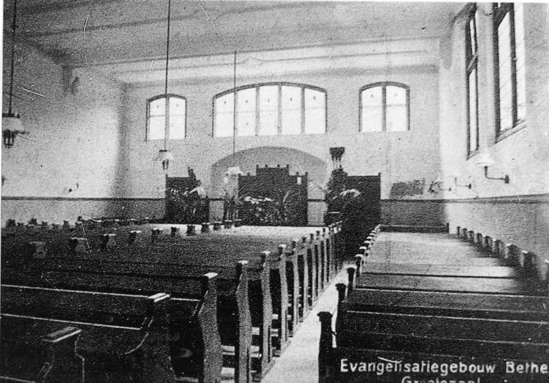 Evangelisatiegebouw Bethel, interieur grote zaal omstreeks 1911 (foto Stadsarchief 's-Hertogenbosch)